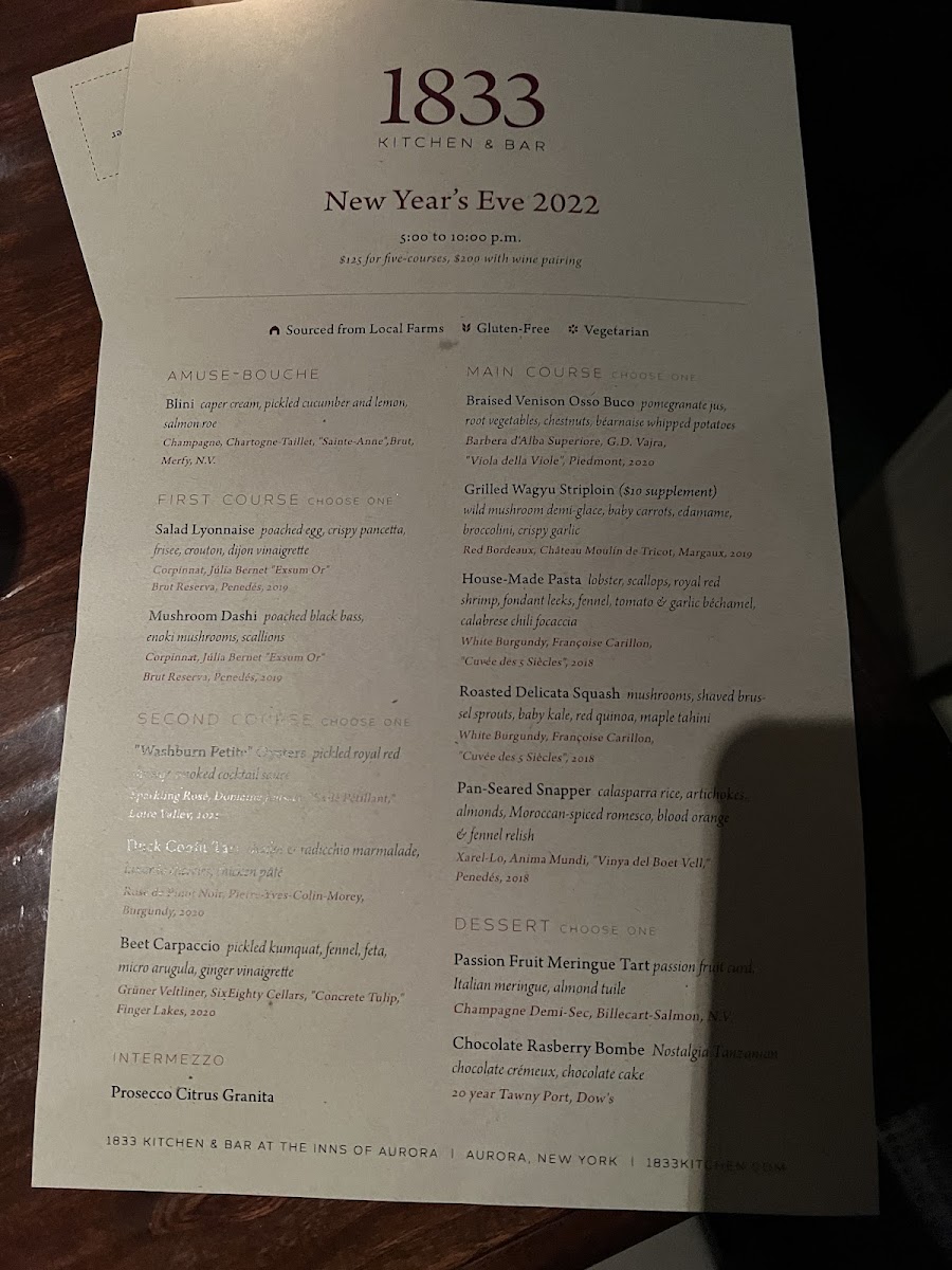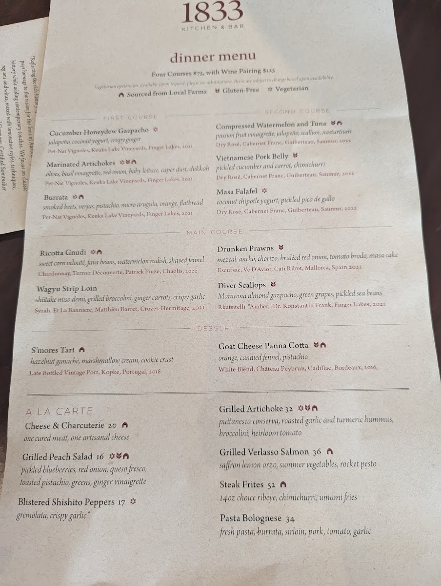 “ An exceptional experience. If you are not staying in Aurora, this restaurant is worth every mile driven to reach it. An outstanding multicourse prix fixe menu (available with wine pairings) and an outstanding wine program featuring a long list of wines by the glass. The culinary skills were matched in by a very attentive front of house team. A warm welcome, menu orientation, flawless delivery of drinks and courses, all at an unrushed cadence. As OpenTable diners we appreciated the ability to book in advance and communicate with the hosts. 1833 Kitchen and Bar has landed on our "consider this" list when booking a stay in the Finger Lakes. Well done. Footnote, I wish I had taken more photos of the food and restaurant environment, yet the absence of those indicates where our attention was placed. ”